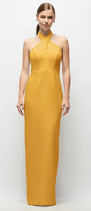 Criss-Cross Halter Open-Back Crepe Column Maxi Dress in NYC yellow