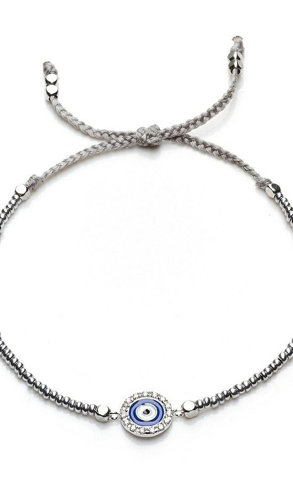This stackable friendship bracelet with crystal encrusted Evil Eye detail, silver-tone beading, and braided thread closure makes an excellent thank you gift for your squad!