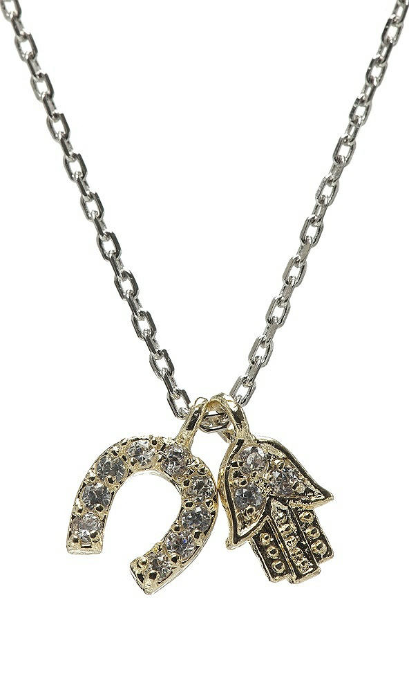 Good luck charm necklace with gold-plated Hamsa and Horseshoe charms accented with cubic zirconia pave on a sterling silver chain.