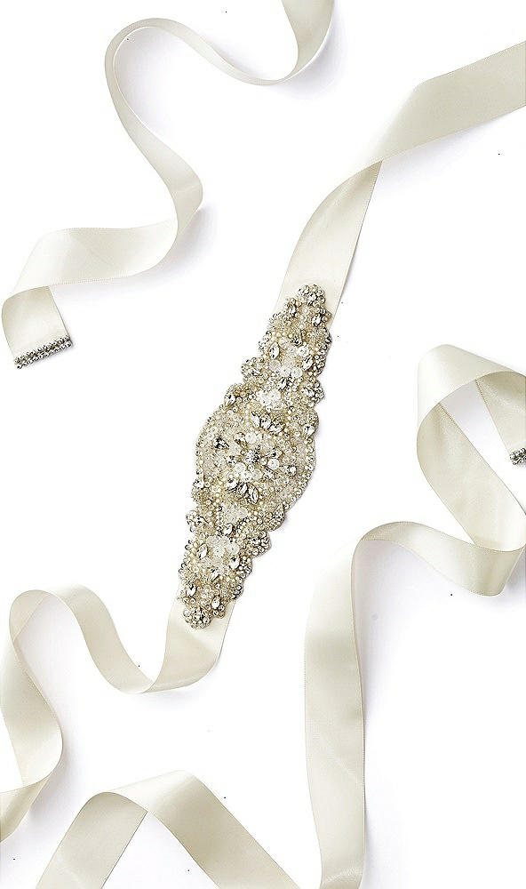 Dessy's intricately hand beaded Jackie bridal sash is a stunning addition to any wedding dress. An opulent array of densely beaded crystals and sequins adorn this sash. Ivory satin 1 1/4" ribbon with tie closure. Sash approx 104-105" in total length. Medallion is approx 2 1/2" high at center. Beading is approx 7 1/2" long from one end to other.