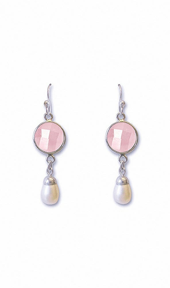 These chandelier earrings feature a pearl drop and a circular rose-colored stone in a high polish sterling setting.