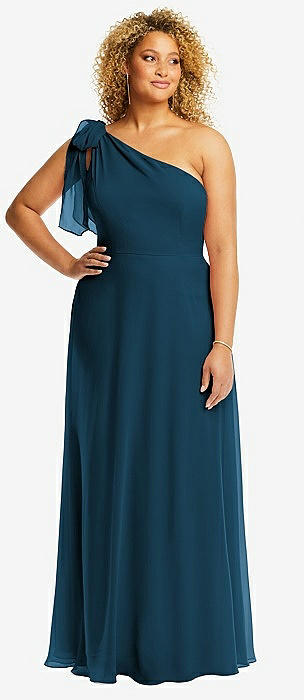 Cascading Bow One-Shoulder Stretch Satin Mermaid Dress with Slight Train in atlantic blue