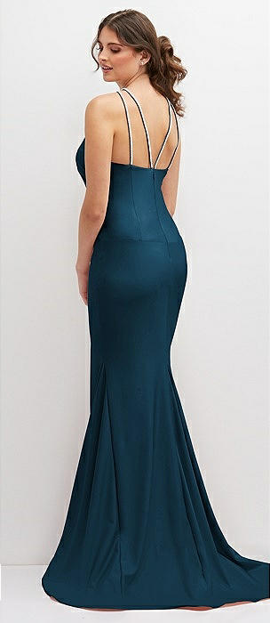 Halter Asymmetrical Draped Stretch Satin Mermaid Dress with Rhinestone Straps in atlantic blue