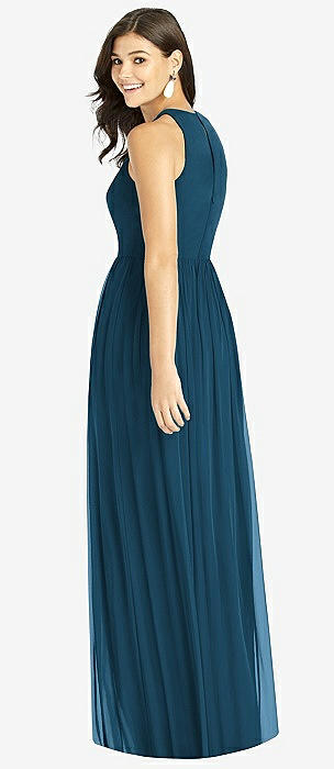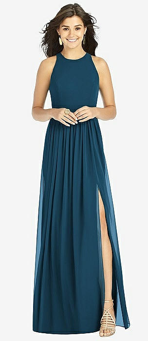 Shirred Skirt Jewel Neck Halter Dress with Front Slit in atlantic blue