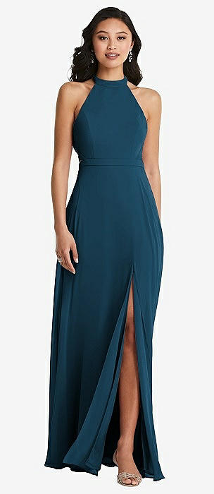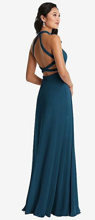 Stand Collar Halter Maxi Dress with Criss Cross Open-Back in atlantic blue