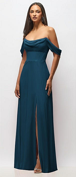 Off-the-Shoulder Basque Corset Chiffon Maxi Dress in atlantic blue