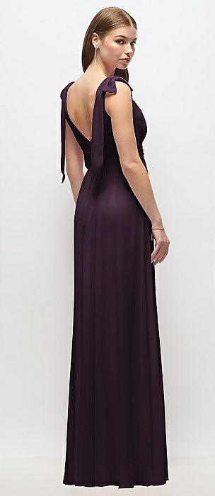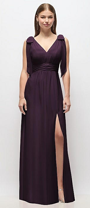 Plunge Neckline Bow Shoulder Empire Waist Chiffon Maxi Dress in aubergine