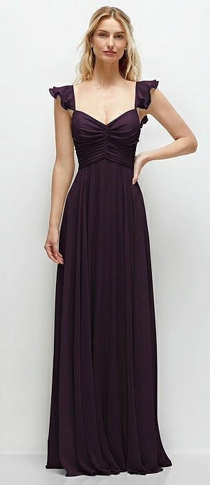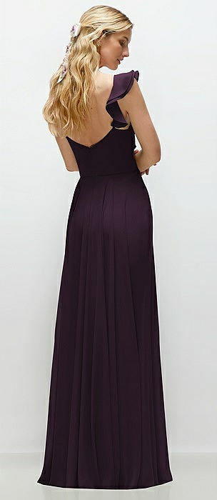 Convertible Ruffle Strap Chiffon Maxi Dress with Full Circle Skirt in aubergine