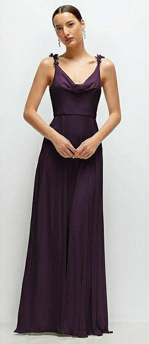 Cowl Neck Chiffon Maxi Dress with Hand-Worked Petal Straps in aubergine