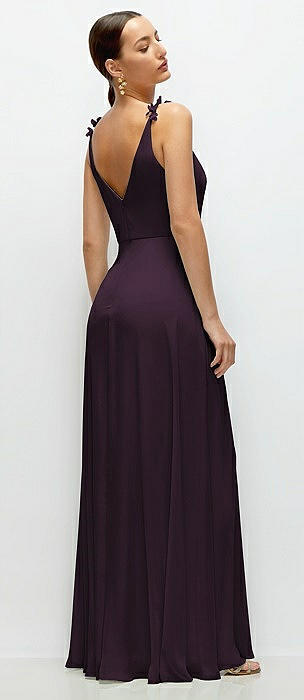 Bow-Shoulder V-Back Chiffon Gown with Front Slit in aubergine