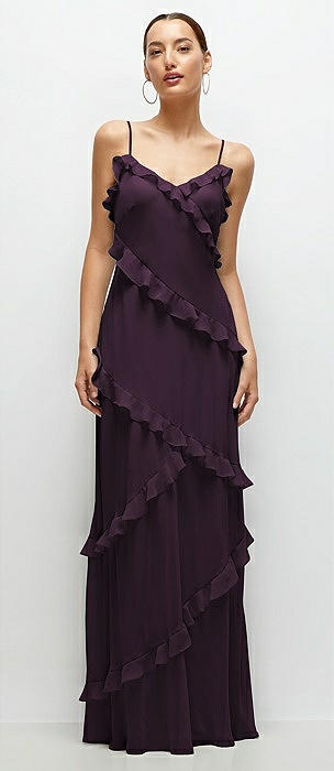 Tiered Chiffon Maxi A-line Dress with Convertible Ruffle Straps in aubergine