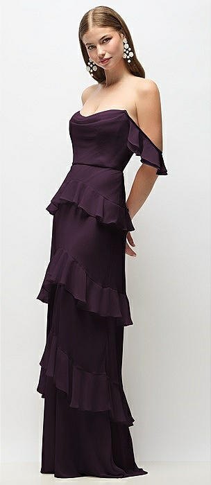 Off-the-Shoulder Cowl Chiffon Tiered Ruffle Maxi Dress with Convertible Ruffle Straps in aubergine