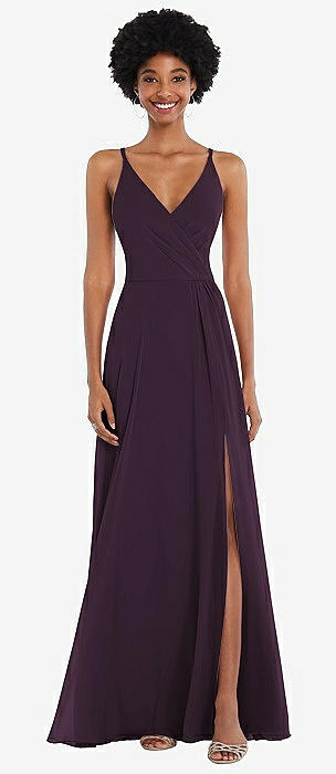 Spaghetti Strap Draped Skirt Gown with Front Slit in aubergine