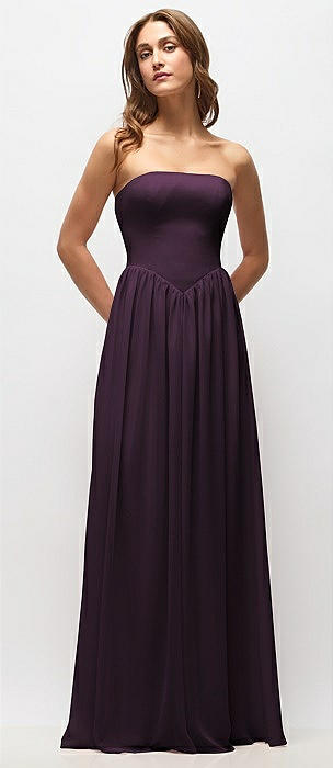Strapless Basque Drop Waist Chiffon Maxi Dress with Shirred Skirt in aubergine