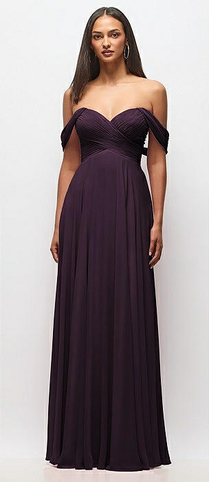 Off-the-Shoulder Draped Chiffon Maxi Dress in aubergine
