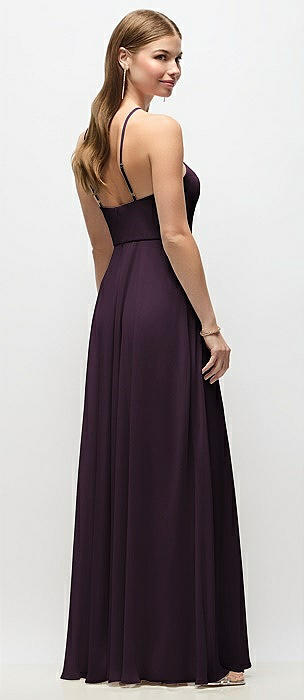 High-Neck Halter Chiffon Maxi Dress with Adjustable Spaghetti Straps in aubergine