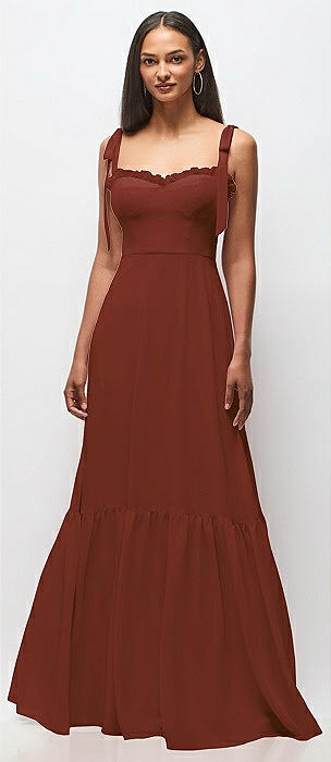 Tie-Shoulder Bustier Bodice Ruffle-Hem Maxi Dress in auburn moon