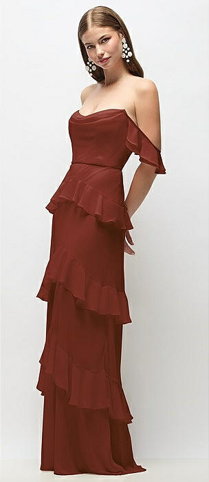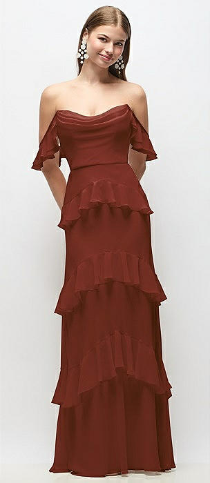 Off-the-Shoulder Cowl Chiffon Tiered Ruffle Maxi Dress with Convertible Ruffle Straps in auburn moon
