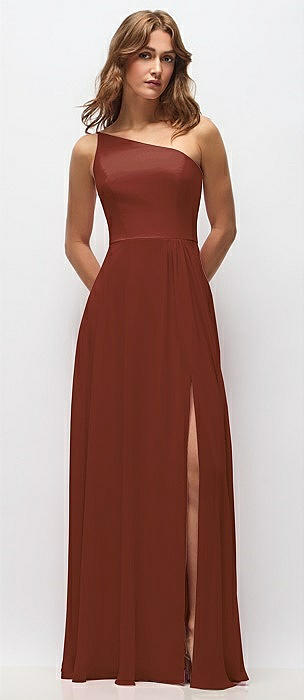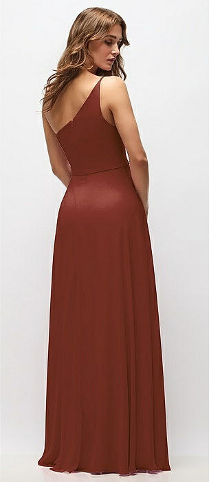 One-Shoulder Chiffon Maxi Dress with Shirred Front Slit in auburn moon