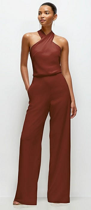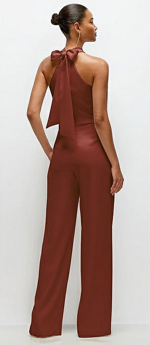 Pleated Halter Blouson Crepe Wedding Jumpsuit with Self-Tie Bow Back in auburn moon
