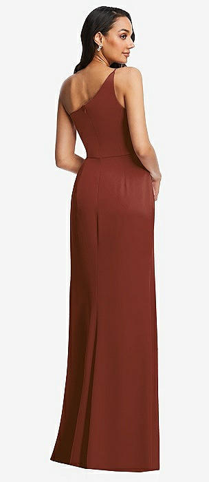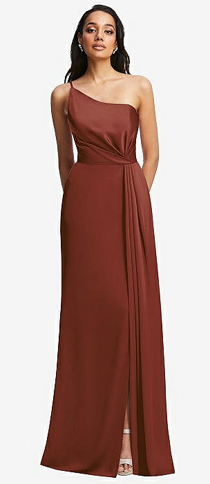 One-Shoulder Draped Skirt Satin Trumpet Gown in auburn moon