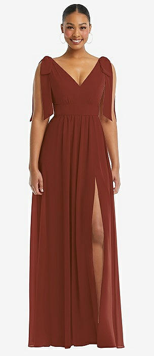 Bow-Shoulder V-Back Chiffon Gown with Front Slit in auburn moon