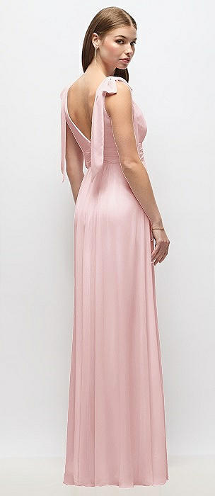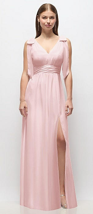 Plunge Neckline Bow Shoulder Empire Waist Chiffon Maxi Dress in ballet pink