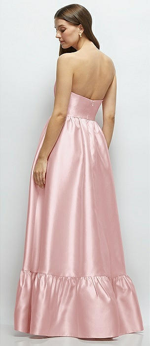 Strapless Satin Maxi Dress with Cascade Ruffle Peplum Detail in ballet pink