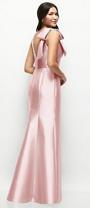 Deep V-back Satin Trumpet Dress with Cascading Bow at One Shoulder in ballet pink