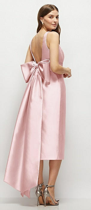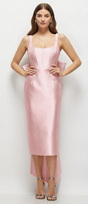 Scoop Neck Corset Satin Midi Dress with Floor-Length Bow Tails in ballet pink