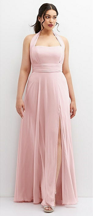 Shirred Skirt Jewel Neck Halter Dress with Front Slit in ballet pink