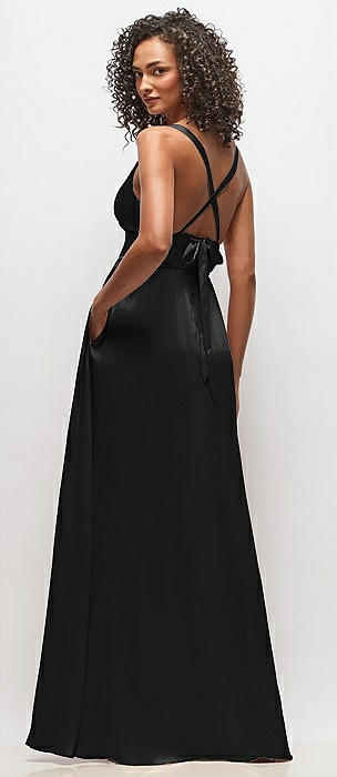 Scoop Neck Corset Satin Maxi Dress with Floor-Length Bow Tails in black