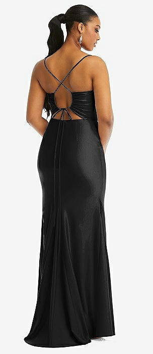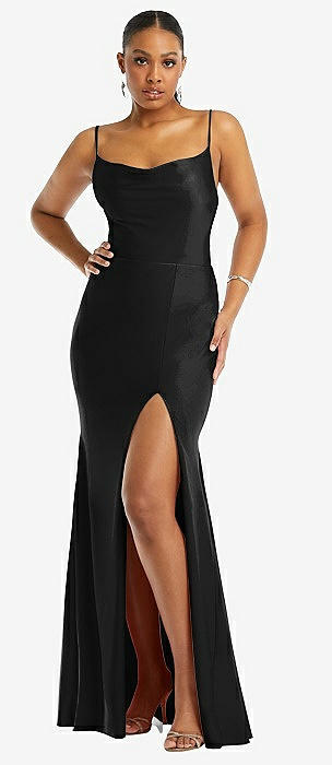 Cowl-Neck Open Tie-Back Stretch Satin Mermaid Dress with Slight Train in black
