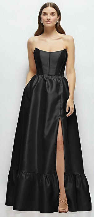 Strapless Satin Gown with Draped Front Slit and Pockets in black