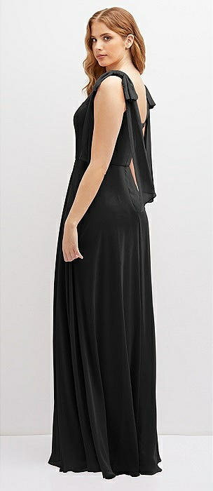 Bow-Shoulder V-Back Chiffon Gown with Front Slit in black