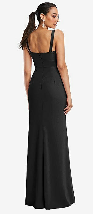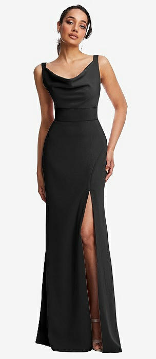 Cowl-Neck Wide Strap Crepe Trumpet Gown with Front Slit in black