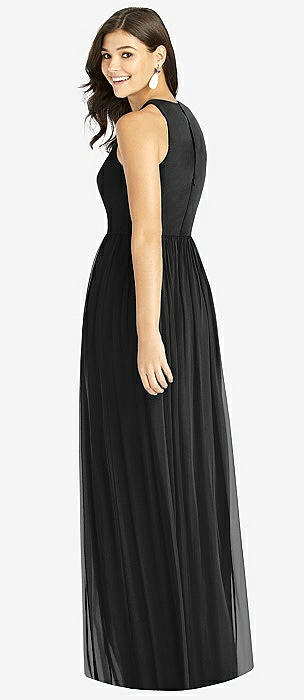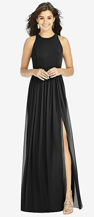 Shirred Skirt Jewel Neck Halter Dress with Front Slit in black