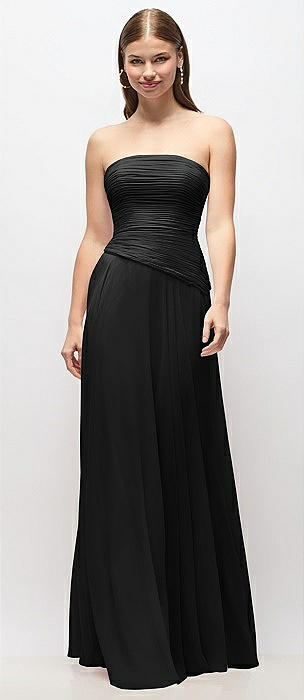 Strapless Chiffon Maxi Dress with Asymmetrical Ruched Drop Waist in black