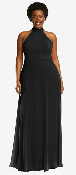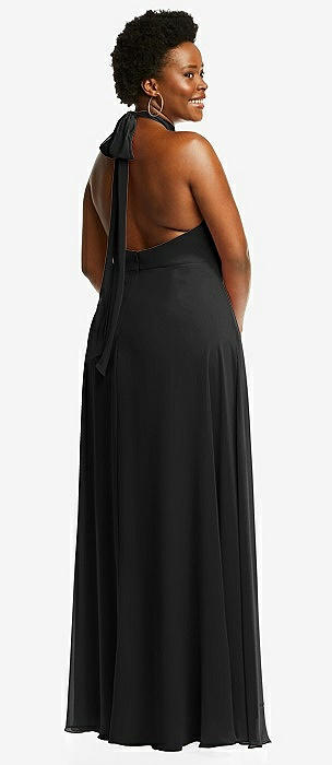 Shirred Skirt Jewel Neck Halter Dress with Front Slit in black