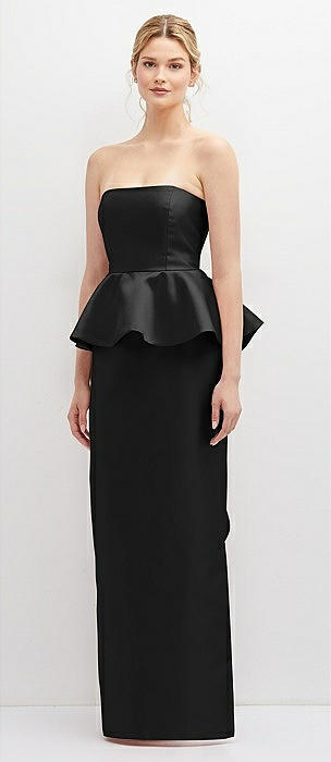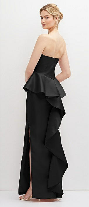 Strapless Satin Maxi Dress with Cascade Ruffle Peplum Detail in black