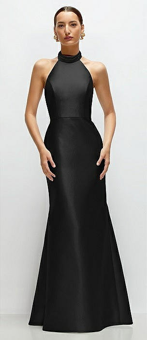 High-Neck Halter Open-Back Satin Trumpet Dress in black