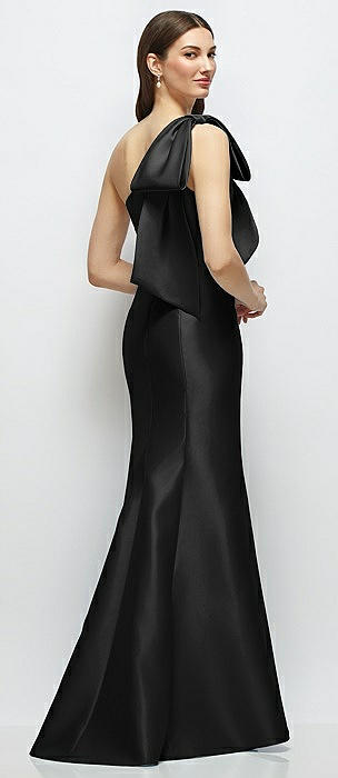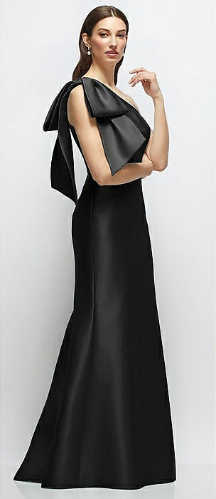 Bow One-Shoulder Satin Maxi Dress with Trumpet Skirt in black