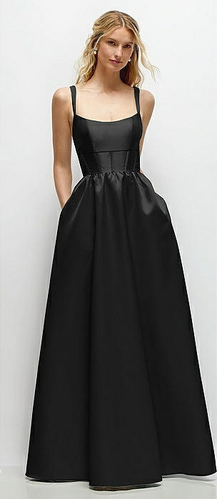 Scoop Neck Drop Basque Skirt Satin Maxi Dress with Pockets in black