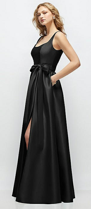 Square Neck Satin Midi Dress with Full Skirt & Flower Sash in black