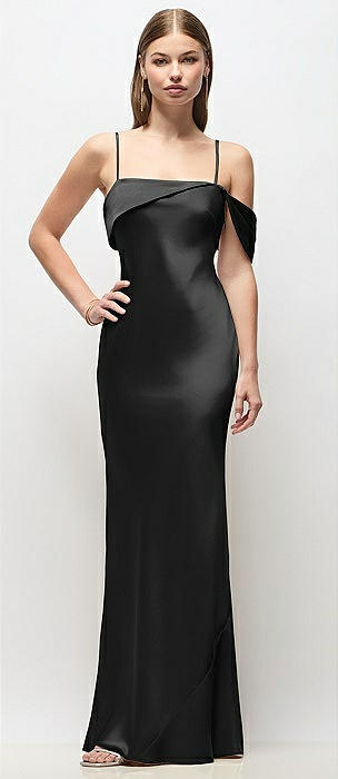 Off-the-Shoulder Swag Ruched Side Satin Bias Maxi Dress with Adjustable Spaghetti Straps in black