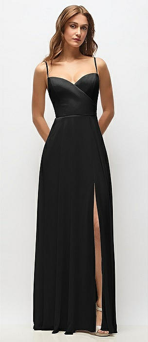 Wrap Bodice Chiffon Maxi Dress with Adjustable Spaghetti Straps in black