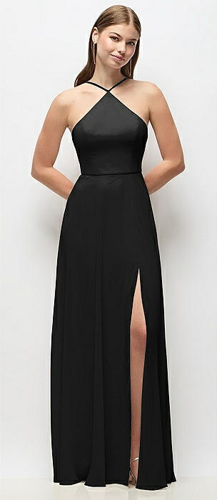 High-Neck Halter Stretch Satin Maxi Dress with Bias A-line Skirt in black