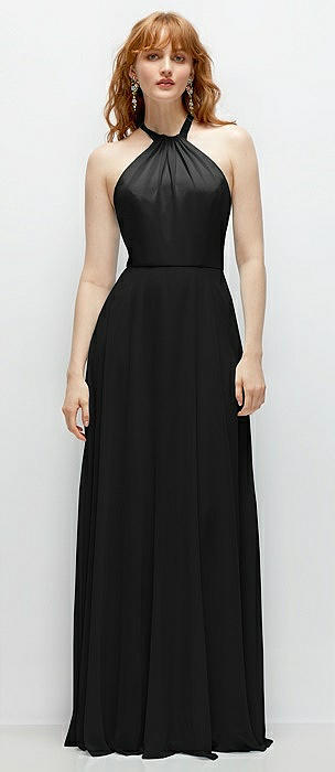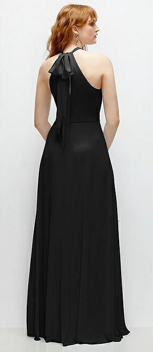 Shirred Halter Chiffon Maxi Dress with Back Sash-Tie Closure in black