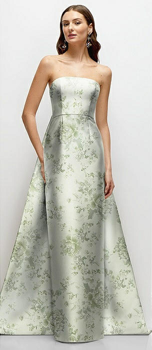 Strapless Floral Satin Column Dress with Removeable Watteau Train in sage cottage rose