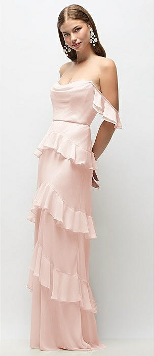 Off-the-Shoulder Cowl Chiffon Tiered Ruffle Maxi Dress with Convertible Ruffle Straps in blush